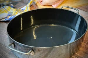 - Etwas Wasser in den Bräter gießen, der Boden sollte dabei nur leicht bedeckt sein.