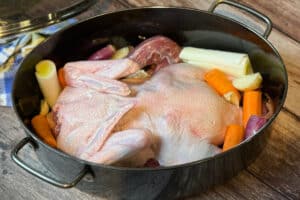 - Die Ente mit der Brustseite nach unten hineinlegen und die Innereien, das Suppengemüse, die Zwiebeln und den Knoblauch ringsherum legen. Den Deckel auflegen und den Bräter in den auf 180 Grad vorgeheizten Backofen oder auf den Grill (indirekt) stellen.