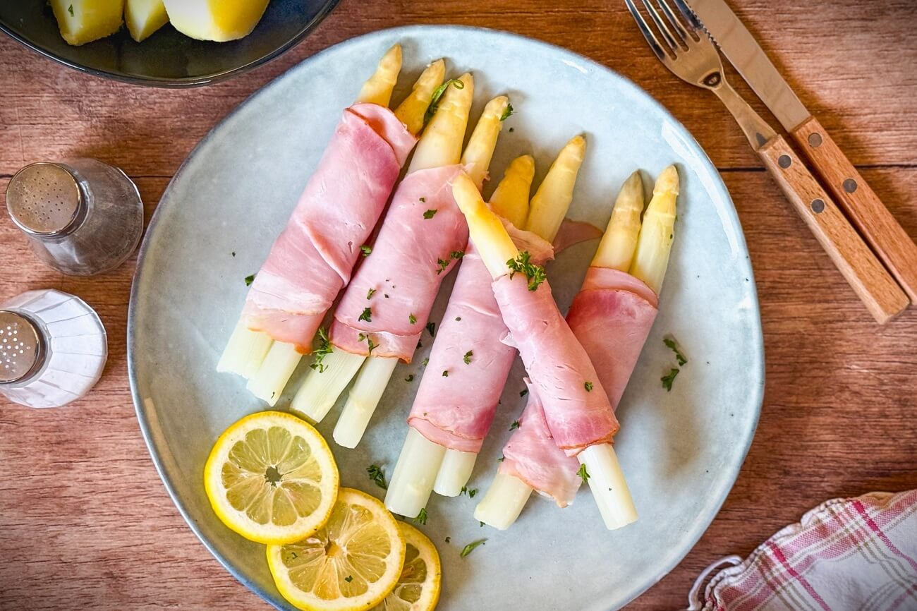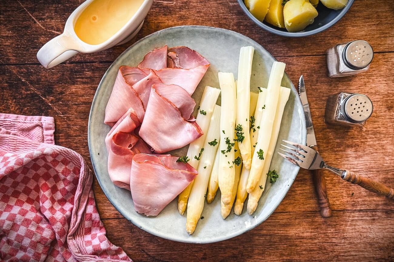 Spargel mit Schinken und Sauce Hollandaise – ein Klassiker der deutschen Küche. Klappt schnell und erfreut zum Abendessen die ganze Familie.