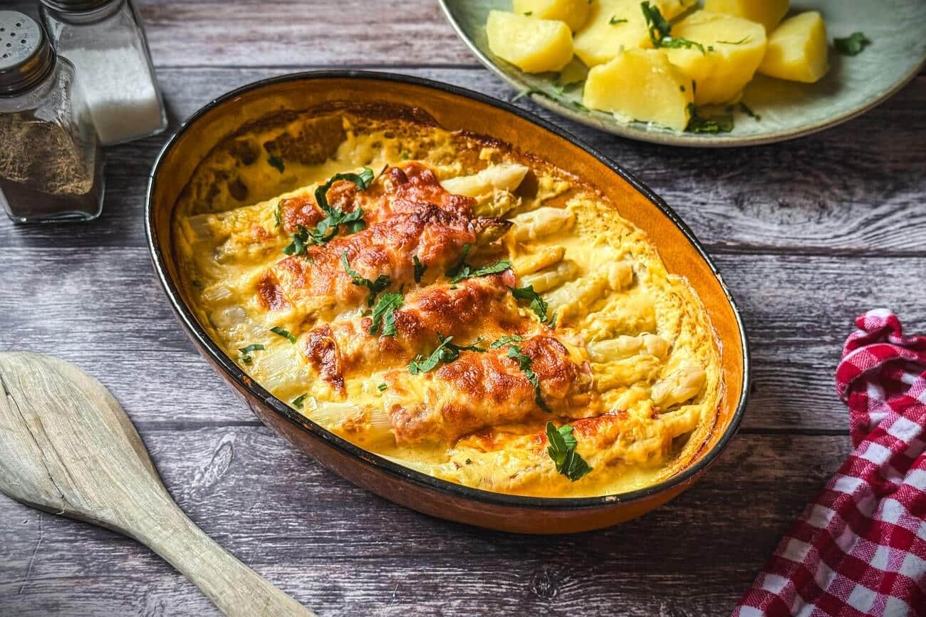 Wer steht nicht auf überbackenen Spargel, der mit cremiger Sauce serviert wird? Perfektes Rezept fürs schnelle Abendessen.