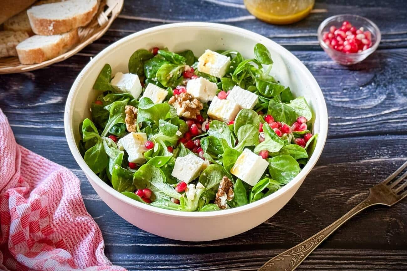 Lecker Feldsalat Rezept mit Feta, Walnüssen und Granatapfelkernen. Mit schnellem und bestem Feldsalat Dressing Rezept.