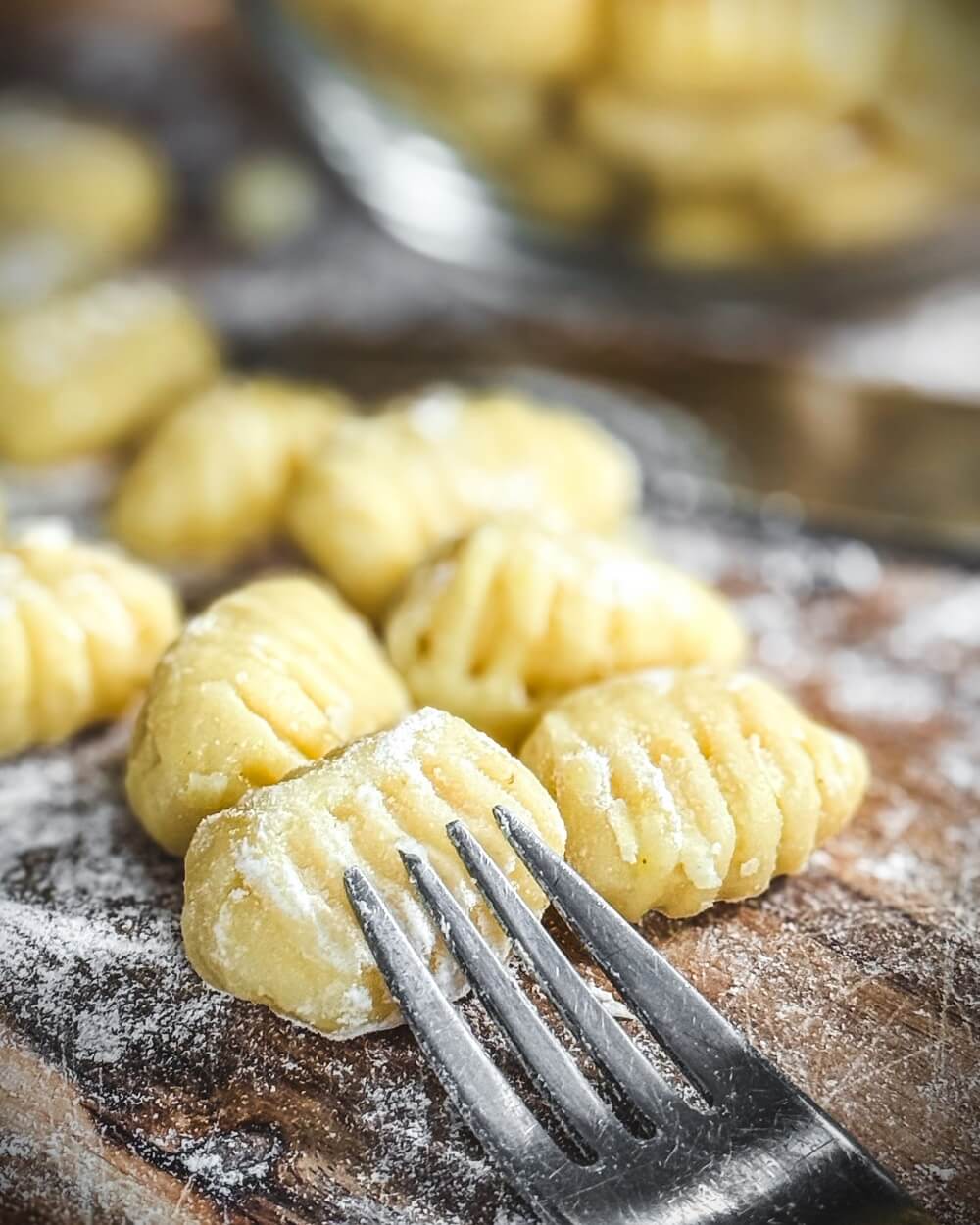 - Eine Gabel mit dem Gabelrücken und leichtem Druck über die Teigkugeln ziehen und Gnocchi formen.