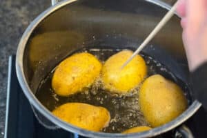 - Zuerst die Kartoffeln kochen, das dauert je nach Größe 25 bis 30 Minuten. Stäbchenprobe machen!