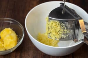 - Dann durch eine Kartoffelpresse drücken.