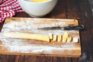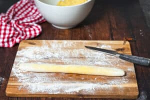 - Nun ca 2 cm dicke Stücke abschneiden und jeweils zu länglichen Kugeln formen und mit etwas Mehl bestäuben.