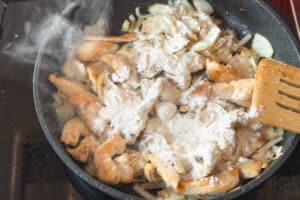 Das Wenden in Mehl hat zwei Effekte. Zum einen bekommt das Fleisch beim Anbraten eine leichte Kruste. Zum anderen bindet das Mehl später die Soße etwas an und macht sie sämiger. Bei einem cremigen Rezept wie diesem ist das jedoch nicht zwingend notwendig.