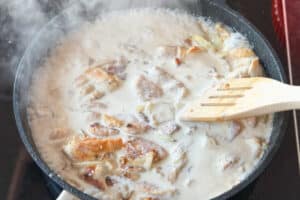 - Die Brühe und die Sahne unterrühren und kurz köcheln lassen, bis die Soße schön cremig geworden ist.