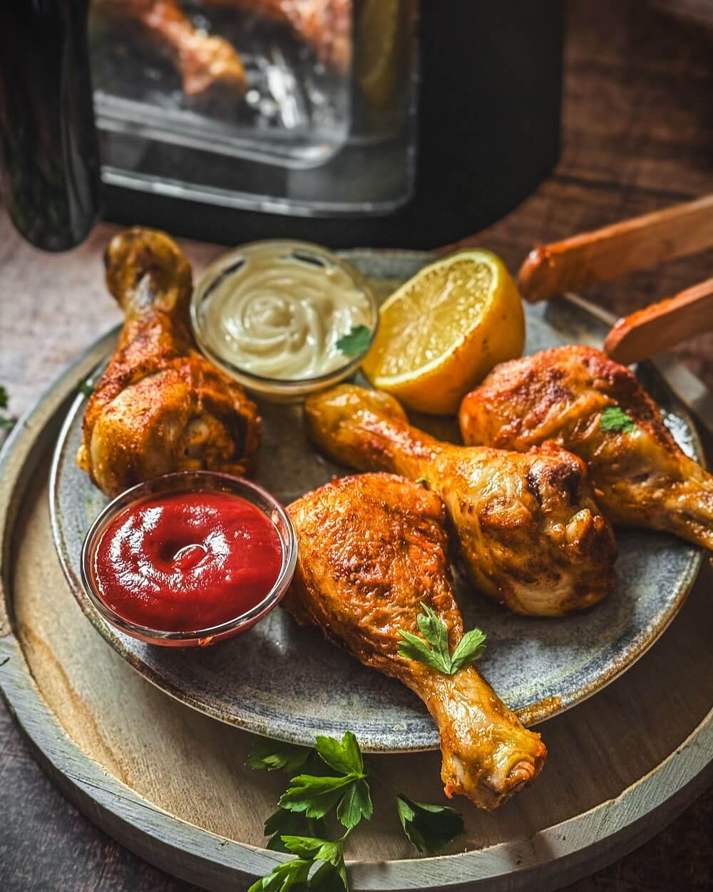 - Hähnchenunterschenkel: liefern saftiges Fleisch und sorgen durch die Haut für eine schöne Bräune in der Heißluftfritteuse.
