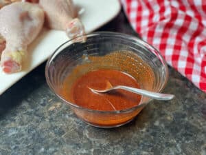 Öl und Gewürz in einer Schüssel verrühren, bis eine gleichmäßige Mischung entsteht. Anschließend die Hähnchenunterkeulen rundum mit dem Pinsel mit der Marinade bestreichen, damit später Geschmack und Bräune gleichmäßig verteilt sind.