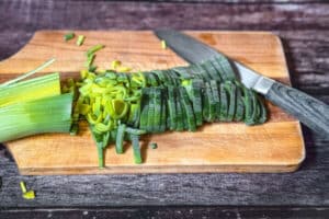 - Den Lauch der Länge nach halbieren, dabei nicht über den Strunk hinaus schneiden. Anschließend gründlich waschen und in Streifen schneiden. Wer will darf natürlich auch den Lauch in Ringe schneiden. Ich halbiere gerne weil man dann besser unter fließendem Wasser waschen kann.