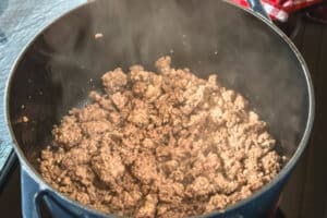 - Das Speiseöl in einem großen Topf erhitzen. Das Hackfleisch hineingeben und bei mittlerer bis hoher Hitze krümelig anbraten.