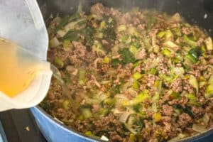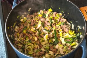 Hackfleisch kräftig anbraten und mit Zwiebel sowie Lauch ergänzen. Dabei entsteht die geschmackliche Grundlage, auf der die Suppe aufbaut.