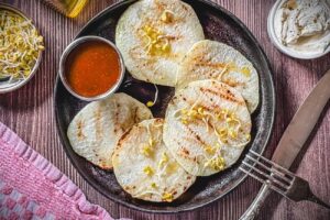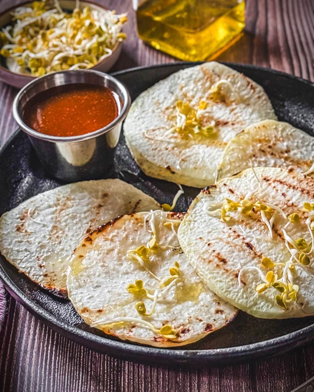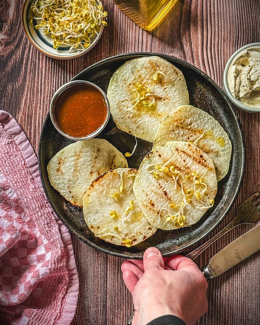 - Die fertigen Kohlrabischeiben auf einen Teller legen und servieren, salzen und pfeffern, mit Sprossen garnieren und mit den gewünschten Dips servieren.