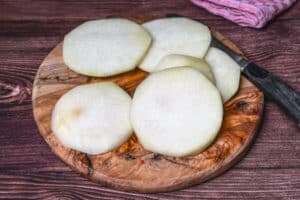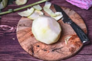 - Die geschälten Kohlrabi in etwa 1 cm dicke Scheiben schneiden.