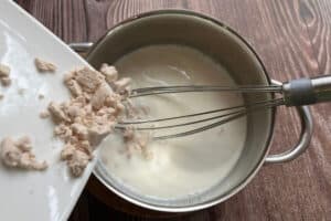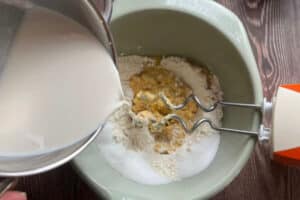 - Die lauwarme Milch in ein Gefäß füllen und die frische Hefe hineinrühren, bis sie sich vollständig aufgelöst hat.
