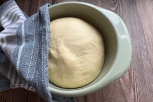 - Den Teig abgedeckt bei Zimmertemperatur stehen lassen, bis er deutlich aufgegangen ist.