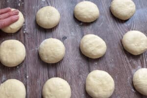 - Aus dem Teig faustgroße, zirka 80 g schwere Kugeln formen, leicht flach drücken, auf eine leicht bemehlte Unterlage setzen und weitere 15 Minuten abgedeckt mit Folie oder einem feuchten Geschirrtuch ruhen lassen.