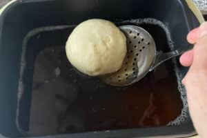 - Die Teiglinge in heißes Fett bei zirka 160 Grad, nicht höher, geben und etwa drei Minuten hellbraun ausbacken. Währenddessen den Deckel schließen.