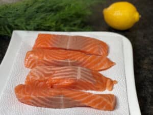 Die tiefgekühlten Lachsfilets auf Küchenpapier im Kühlschrank vollständig auftauen lassen, damit austretende Flüssigkeit aufgenommen wird und der Fisch fest bleibt. Dieser Schritt sorgt dafür, dass die Filets später gleichmäßig garen.