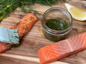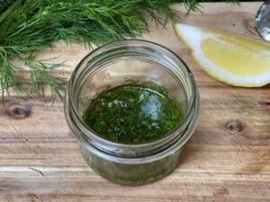 - Zitronensaft und Olivenöl in einer Schüssel verrühren, anschließend Knoblauch, Salz, Pfeffer, Chiliflocken, Honig und Dill unterrühren, bis eine gleichmäßige Marinade entsteht.
