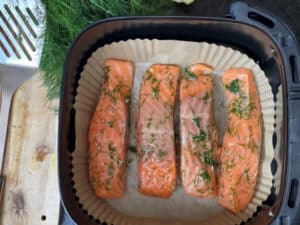 - Lachsfilets in den Korb der Heißluftfritteuse legen und bei 160 °C etwa 10 Minuten garen.