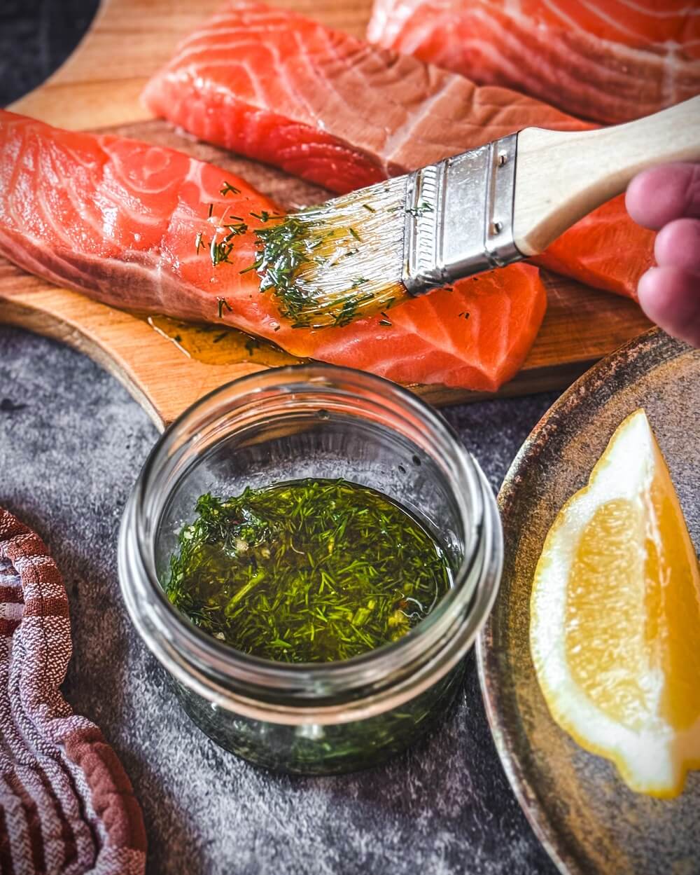 Die Marinade gleichmäßig auf der Fleischseite verteilen und den Fisch abgedeckt im Kühlschrank ziehen lassen. Vor dem Garen überschüssige Marinade leicht abstreifen, damit der Lachs braten oder grillen kann und nicht nur dünstet.