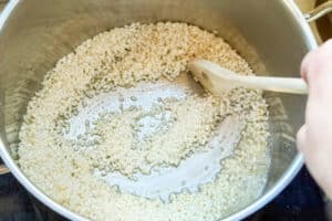 - In einem großen Topf die Butter erhitzen und den Milchreis darin kurz unter Rühren anschwitzen.