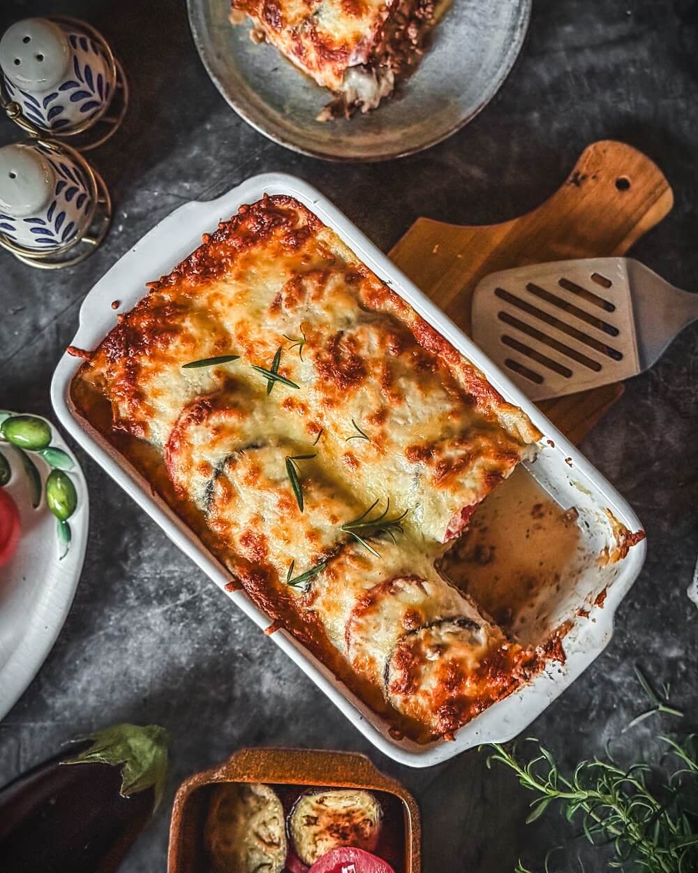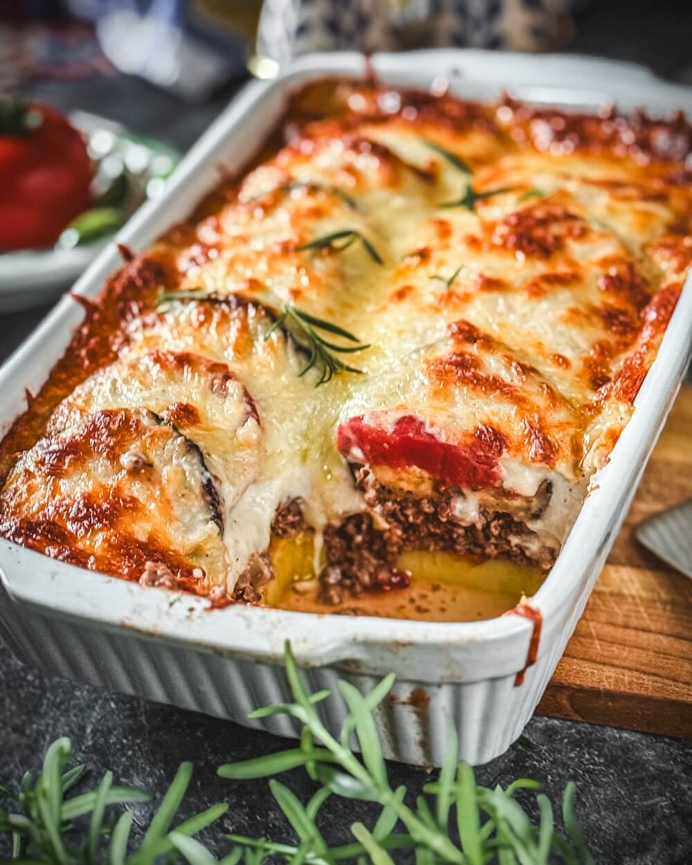 - Frische Tomaten: ergänzen den Schichtaufbau und bringen zusätzliche Frische in den oberen Bereich des Auflaufs.