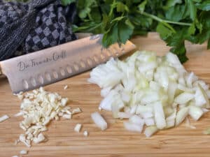 - Zwiebel schälen und fein würfeln. Knoblauchzehen ebenfalls schälen und möglichst fein hacken. Beides getrennt bereitlegen, damit beim Braten alles griffbereit ist.