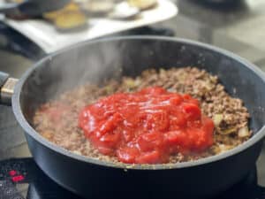 - Stückige Tomaten zum Hackfleisch geben und gründlich unterrühren. Die Mischung einige Minuten köcheln lassen, sodass sich Fleisch und Tomaten verbinden und überschüssige Flüssigkeit leicht reduziert. Dann die Fleischsauce beiseite stellen.