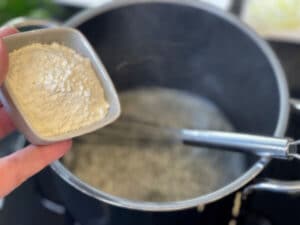 - Mehl zur Butter geben und unter ständigem Rühren anschwitzen. Die Mischung darf leicht klumpig sein, sollte aber hell bleiben, damit die Sauce später sauber bindet.
