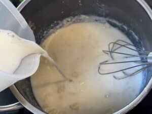 - Milch nach und nach zugießen und dabei kontinuierlich mit dem Schneebesen rühren. Anfangs ist die Sauce sehr dick, wird mit weiterer Milchzugabe aber glatt und cremig.