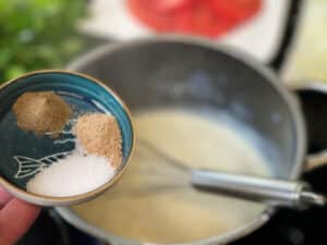 - Sauce mit Salz, Pfeffer und Muskatnuss würzen und kurz köcheln lassen, bis sie sämig ist. Sie soll gut vom Löffel fließen, aber nicht zu dünn sein.