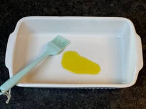 - Backofen auf 180 Grad Ober Unterhitze vorheizen. Eine Auflaufform (30cm x 16 cm x 6cm) leicht einfetten.
