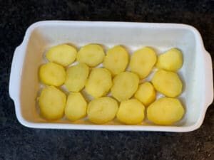 - Kartoffelscheiben gleichmäßig auf dem Boden der Form verteilen, sodass eine möglichst geschlossene Schicht entsteht.