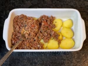 - Hackfleischsauce auf den Kartoffeln verteilen und glatt streichen. Darauf achten, dass die Sauce bis an die Ränder reicht.