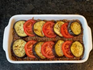 - Auberginen- und Tomatenscheiben dachziegelartig auf der Hackfleischschicht anordnen.