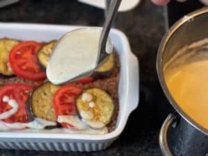 - Die Bechamel Sauce gleichmäßig über den Auflauf gießen.