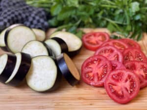 - Auberginen waschen, die Enden abschneiden und in gleichmäßige, etwa 1 cm dicke Scheiben schneiden. Tomaten waschen, den Strunk entfernen und ebenfalls in Scheiben schneiden. Gleichmäßige Scheiben sorgen später für ein sauberes Schichtbild.