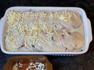- Geriebener Käse: bildet beim Backen die obere Schicht und sorgt für eine geschlossene Oberfläche.