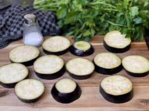 - Auberginenscheiben nebeneinander auf Küchenpapier oder einem Brett auslegen und von beiden Seiten mit Salz bestreuen - also auf jeder Seite eine kleine Prise darauf verteilen. Etwa 20 Minuten ziehen lassen, damit überschüssige Flüssigkeit austritt und die Auberginen beim Braten weniger Fett aufnehmen.