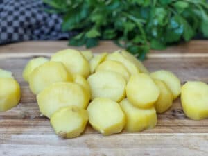 - Kartoffeln schälen, in Scheiben schneiden und in einen Topf geben. Mit Salzwasser bedecken und gar kochen, bis sie weich sind, aber noch gut ihre Form halten. Anschließend abgießen und kurz ausdampfen lassen.