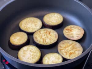 - Auberginen nach der Ziehzeit auf Küchenpapier abtropfen lassen bzw. trocken tupfen. Zwei Esslöffel Olivenöl in einer Pfanne erhitzen und die Scheiben portionsweise von beiden Seiten anbraten, bis sie weich sind und leichte Röstaromen entwickeln. Beiseitestellen.