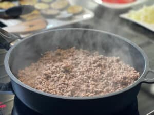 - Restliches Olivenöl in derselben Pfanne erhitzen. Hackfleisch hineingeben und bei mittlerer Hitze krümelig anbraten. Regelmäßig wenden, damit es gleichmäßig bräunt und keine großen Klumpen entstehen.