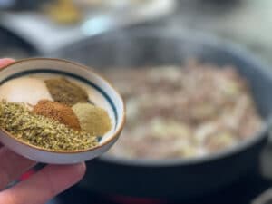 - Während es anbrät die Gewürze herrichten. Ich packe oft alles gleich auf eine Mini-Schüssel, damit ich es später auf einen Satz zugeben kann. Gerne zuvor die Gewürze auch schon vermischen, dann landet zum Beispiel nicht der komplette Oregano auf einem Platz in der Pfanne.