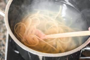 - Nudeln in einem Topf mit kochendem Salzwasser etwa 8 Minuten bissfest kochen und anschließend in ein Sieb abgießen.