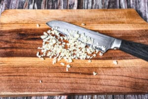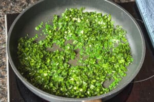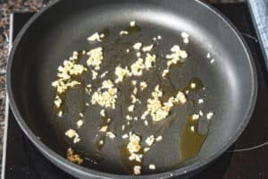 - Olivenöl in einer Pfanne erhitzen und den Knoblauch darin andünsten.