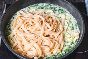 - Nudeln in die Pfanne geben und alles gut vermengen.
