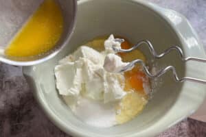 • Quark, Eier, Zucker, Vanillezucker, die Prise Salz und die zerlassene Butter zugeben.