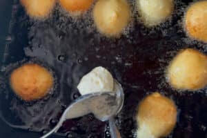 • In einem Topf oder einer Fritteuse das Backfett auf zirka 180 Grad erhitzen und anschließend den Teig abstechen: dazu zuerst einen Teelöffel ins heiße Fett tauchen und mit Hilfe eines zweiten Löffels kleine Bällchen formen.